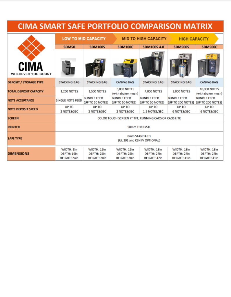 CIMA’s wide range of intelligent deposit/smart safes allow businesses of all sizes to implement an affordable deposit only solution to ensure accurate counting and safe storage of deposited funds. Our range includes note and coin deposit machines that can be used standalone or combined for a complete solution. All of our note deposit machines incorporate our unique self-sealing stacking bag technology, but also have other note deposit options for various capacity requirements.